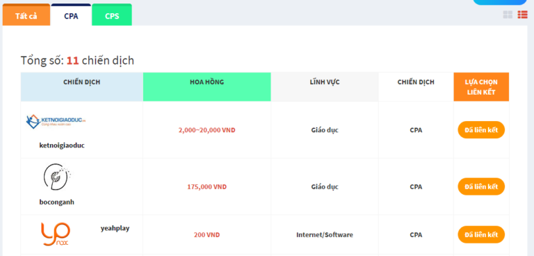 - Đa dạng hình thức chi trả hoa hồng: Sau khi đăng ký xong, bạn sẽ thấy có 2 hình thức chi trả hoa hồng chính: đó là CPA và CPS