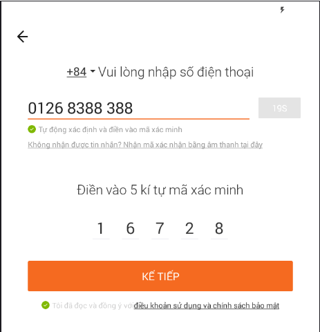 Bước 2 : Mở ứng dụng lên và bấm vào tạo tài khoản – Nhập số điện thoại – Nhập mã code xác thực (được gửi về điện thoại qua tin nhắn) – Nhập mật khẩu.