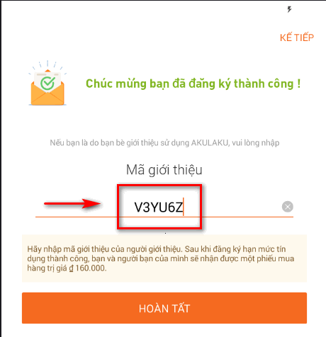 Bước 3: Nhập mã giới thiệu là V3YU6Z (viết hoa) để nhận được 160.000 đ sau khi đăng ký hoàn tất.