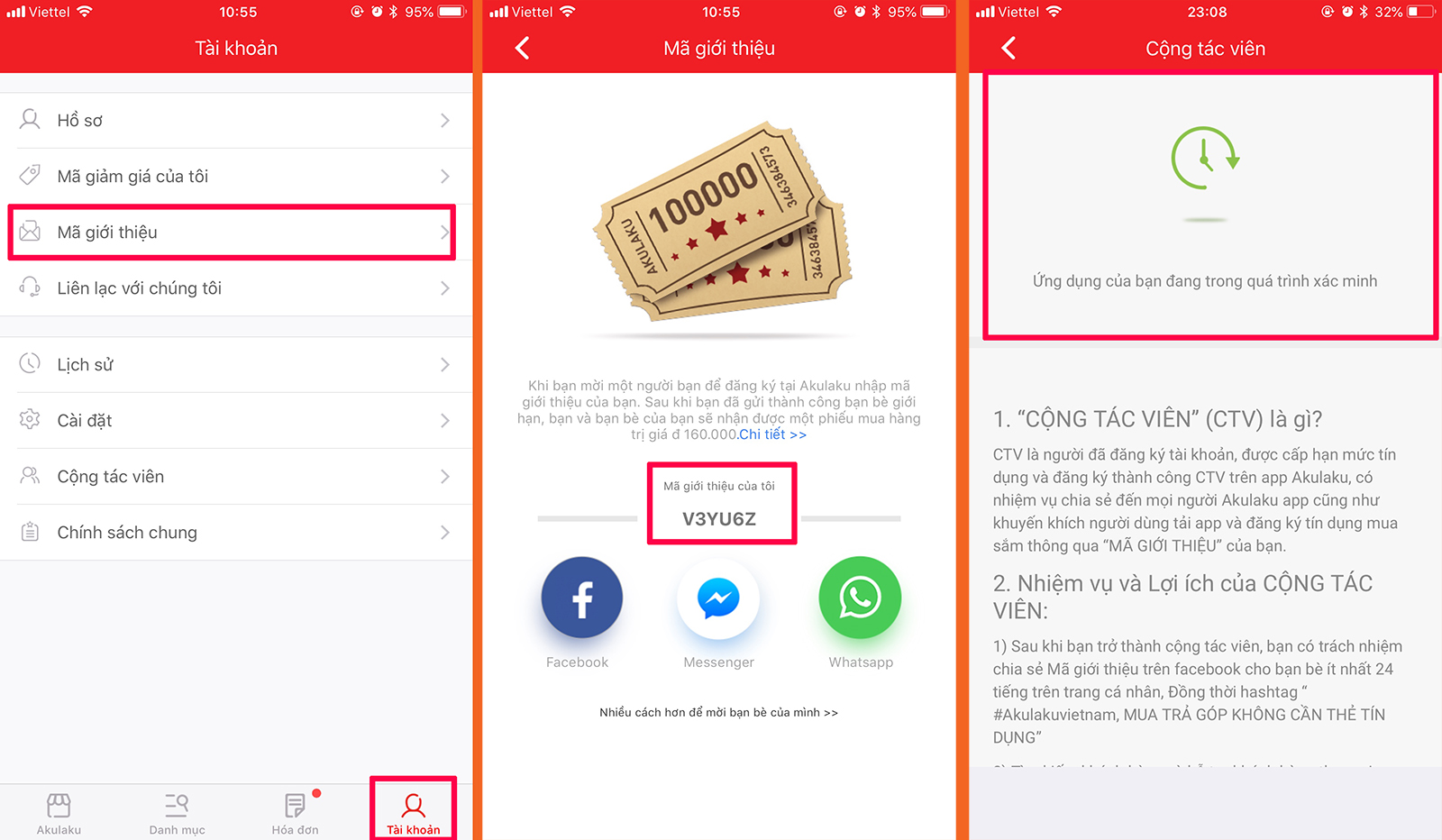 Thực sự thì đây mới là vấn để chủ chốt của bài viết này. Để kiếm tiền từ Akulaku, bạn phải trở thành cộng tác viên (CTV) của họ. Việc của bạn là giới thiệu, hỗ trợ người dùng mới cài đặt app và đăng ký tài khoản. Với mỗi người dùng đăng ký thành công, bạn sẽ nhận ngay 170.000 đ (70.000 đ tiền thưởng có thể rút + mã giảm giá 100.000 đ dùng để mua hàng). Ngoài ra, khi mỗi người dùng mua hàng trả góp trên Akulaku lần đầu tiên bạn sẽ nhận thêm 40.000 đ tiền hoa hồng, rất hấp dẫn phải không?