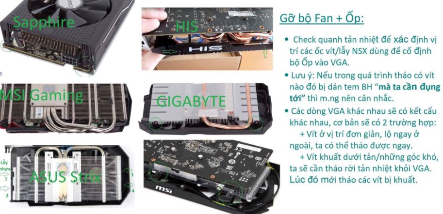 - Các dòng VGA khác nhau sẽ có kết cấu khác nhau, cơ bản sẽ có hai trường hợp: TH1 Vít ở vị trí đơn giản, lộ ngay ở ngoài, ta có thể tháo được ngay. TH2 Vít khuất bên dưới tản/ những góc khó, ta cần phải tháo rời tản nhiệt khỏi VGA, khi đó mới tháo ròi được vít.