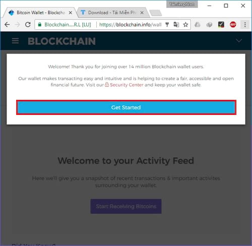 Bước 5: Hoàn thành quá trình tạo ví Bitcoin Blockchain, các bạn nhấn vào Get Started để bắt đầu sử dụng ví Bitcoin của mình. Tuy nhiên bạn hãy thực hiện tiếp ngay bước 6 sau đây.