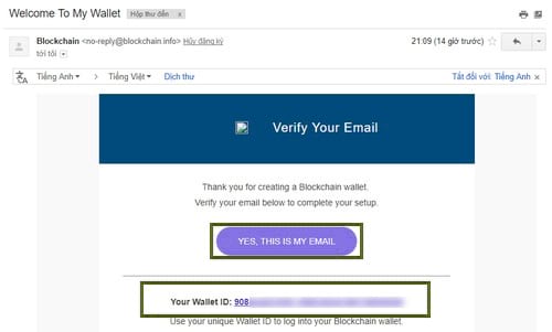 Bước 6: Đăng nhập vào địa chỉ email mà bạn dùng để tạo ví Bitcoin ban nãy sẽ thấy một hộp thư được gửi từ Blockchain có tiêu đề Welcome To My Wallet (Chào mừng bạn đến My Wallet). Trong email bạn hãy chú ý một cái đó là Your Wallet ID, đó chính là ID của bạn dùng để đăng nhập (thông tin đăng nhập tại Blockchain bao gồm ID Wellet và mật khẩu, không phải dùng email để đăng nhập). Đồng thời sau khi xác định được Your Wallet ID của bạn, các bạn nhấn vào YES, THIS IS MY EMAIL để xác minh địa chỉ email cũng như hoàn tất thiết lập của bạn.