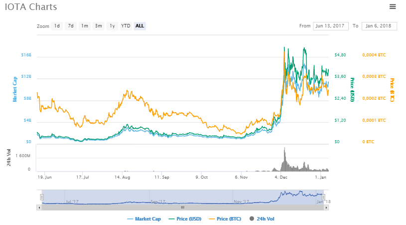 Như biểu đồ trên chúng ta có thể thấy được mức tăng trưởng của đồng IOTA mạnh mẽ mẽ và sôi động như thế nào. Cụ thể thì trong giai đoạn tháng 6 – 8/2017 đồng IOTA có mức tăng trưởng bình quân khá tốt và ổn định, tuy rằng bước sang tháng 9 – 11/2017 có sự suy thoái, quay đầu trở lại đáy. Nhưng bước qua tháng 12 trở lại đây, IOTA đã có bước tăng trưởng tốt, vượt qua cả đỉnh cũ, và nằm trong vùng giao tranh cân bằng giữa mua và bán. Lúc này các bạn có thể mua, vì từ đây cho đến tết nó sẽ còn tăng lên tiếp tục ở các mức cao hơn