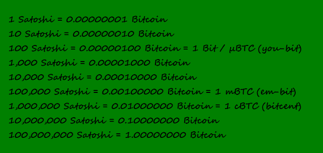 Sau khi bitcoin được tạo ra và phát triển rất manh mẽ thì tới tháng 11/2008, Satoshi Nakamoto quy định giá trị của 1 Bitcoin sẽ là 100 triệu đơn vị con.
