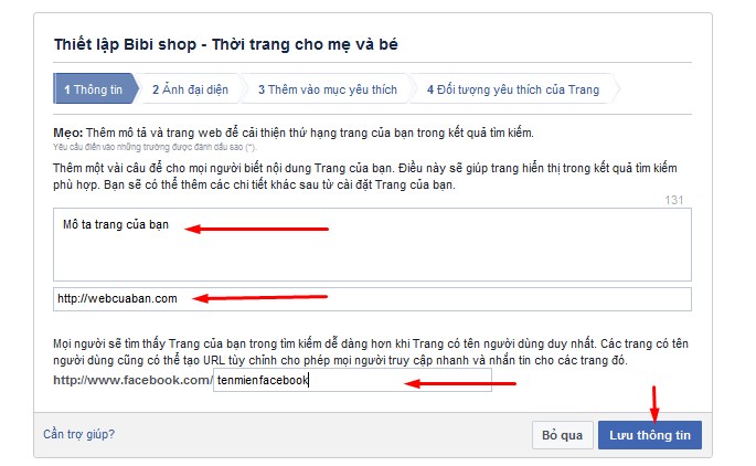 Màn hình hiện ra tiếp theo các bạn điền thông tin cơ bản cho trang của mình