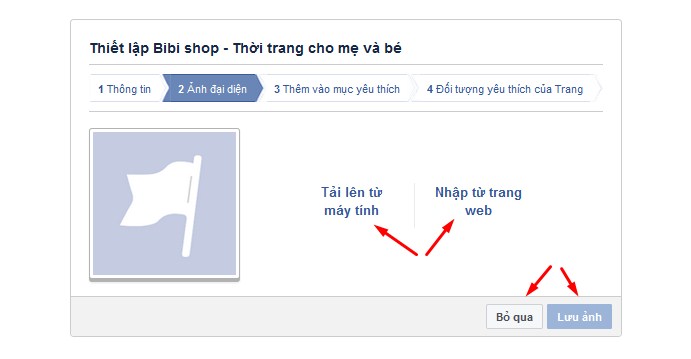 Màn hình hiện ra tiếp theo, các bạn chọn ảnh đại diện cho trang. Bám vào tải ảnh lên để thêm ảnh đại diện. Sau đó chọn “lưu ảnh”. Nếu muốn xong nhanh, để ảnh thay đổi sau các bạn chọn “bỏ qua” cũng được