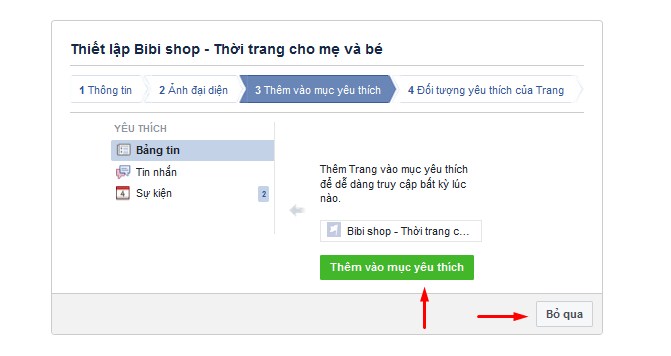 Tiếp theo các bạn chọn chọn có thêm trang vào mục yêu thích không, thường mình sẽ chọn để dễ quản lý, nó luôn hiện ở cột bên trai trang facebook của bạn. Bạn chọn “thêm vào mục yêu thích” hoặc bỏ qua.