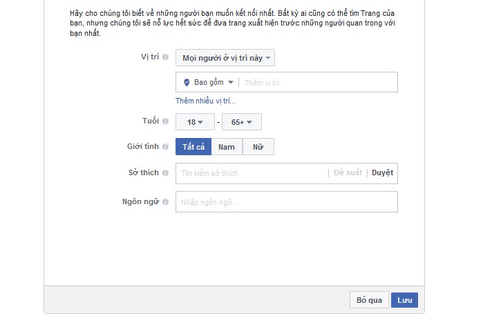 Cuối cùng các bạn chọn đối tượng của trang. khi bạn điền vào mục này sẽ giúp facebook dễ dàng đưa trang của bạn xuất hiện trước những đối tượng phù hợp nhất. Giúp bạn bước đầu target khách hàng mục tiêu.